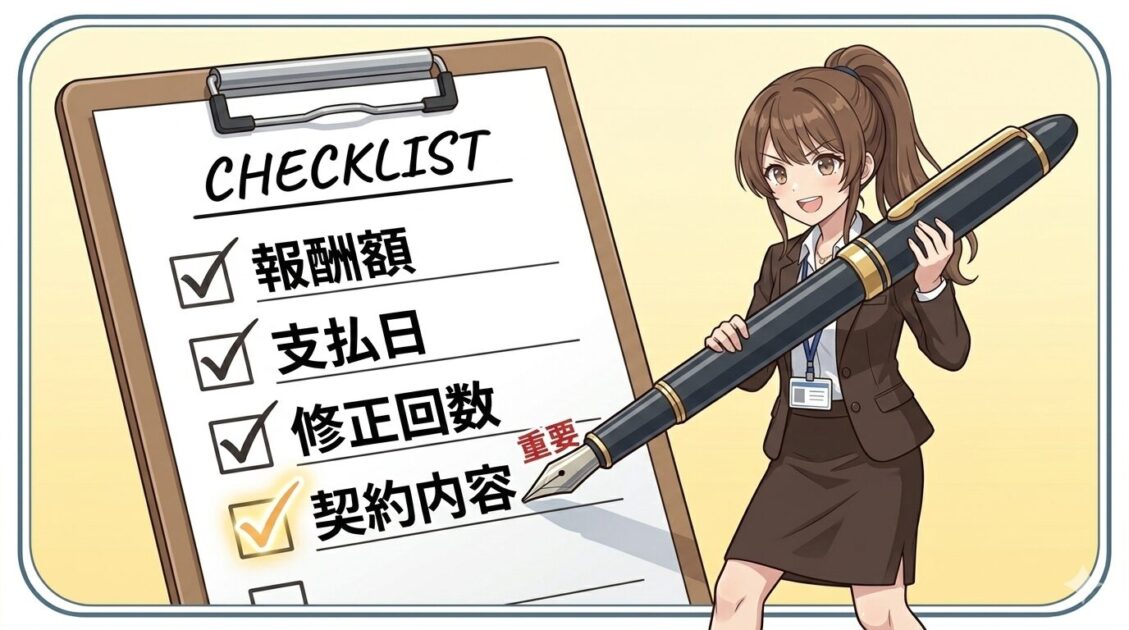 この中でも特に大事なのは、報酬額、支払日、修正回数の3つです。