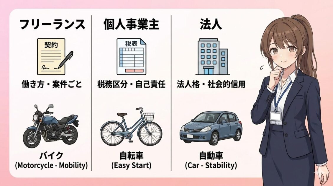 まず整理すると、フリーランス=働き方、個人事業主=税務上の区分、法人=会社です。