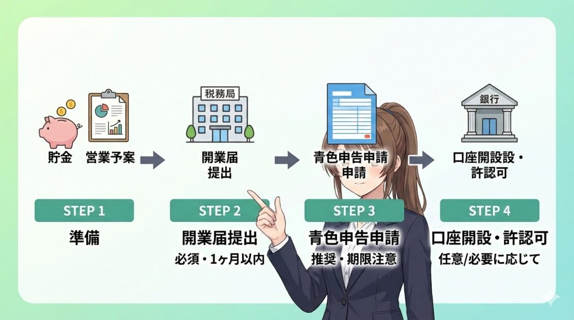 - 青色申告をするなら、青色申告承認申請書も提出(期限に注意)