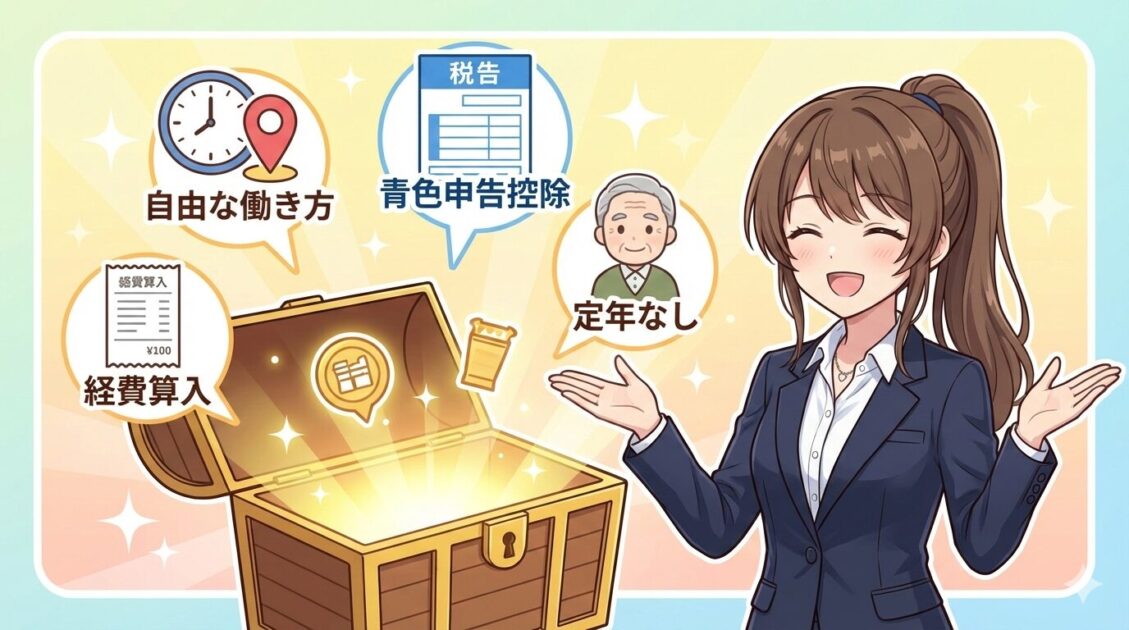 - 雇用契約がなく、仕事は自分で取る(収入は「給与」ではなく「事業のもうけ」)