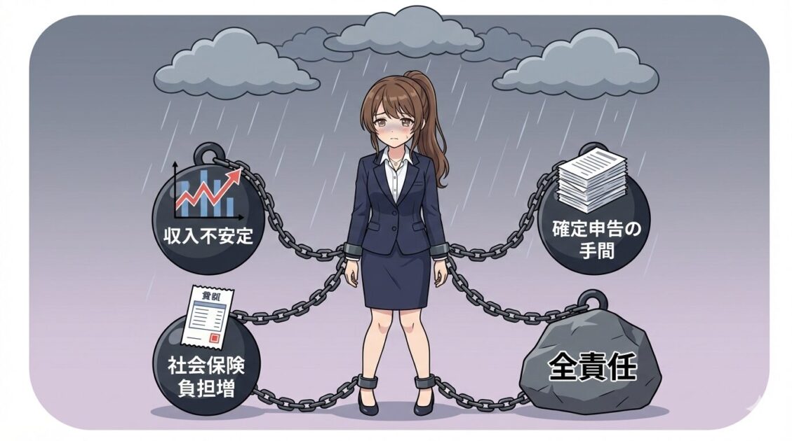 デメリットの中心は、収入の不安定さと負担の増加です。
