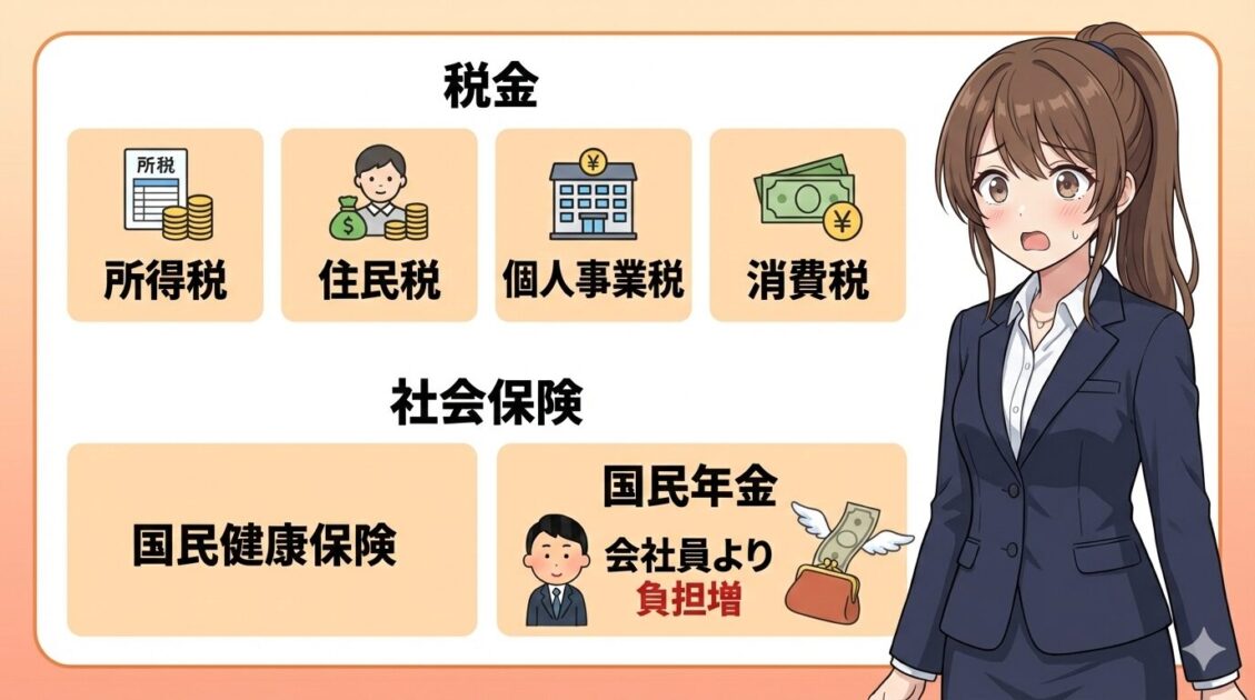 - 社会保険は国民健康保険・国民年金が基本で、会社員より自己負担が重くなりやすい